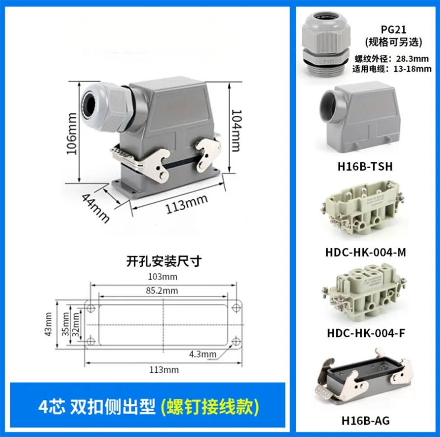 HK-004/0-M HK Heavy duty connectors are working under 80A current . It is 4 pins to contact with wires. It is offering for different working conditions, and popular used in automatic industries and kinds of machine’s wiring connection.