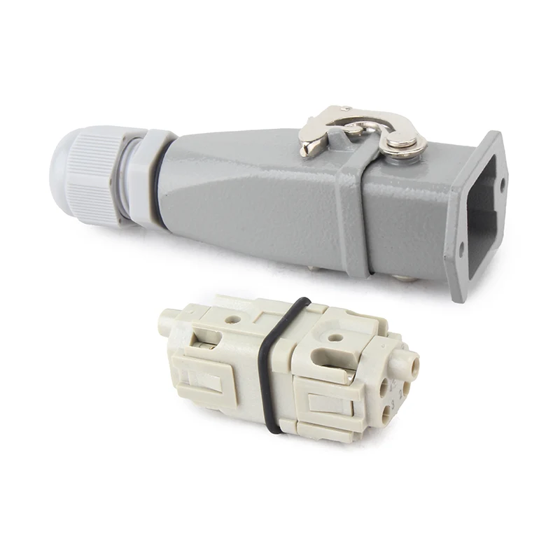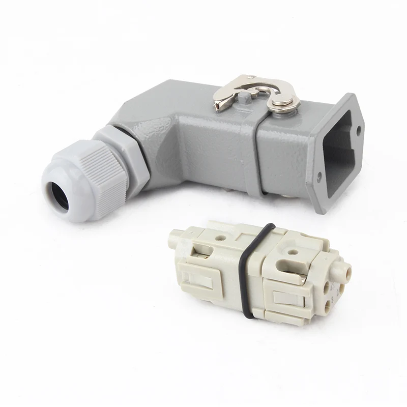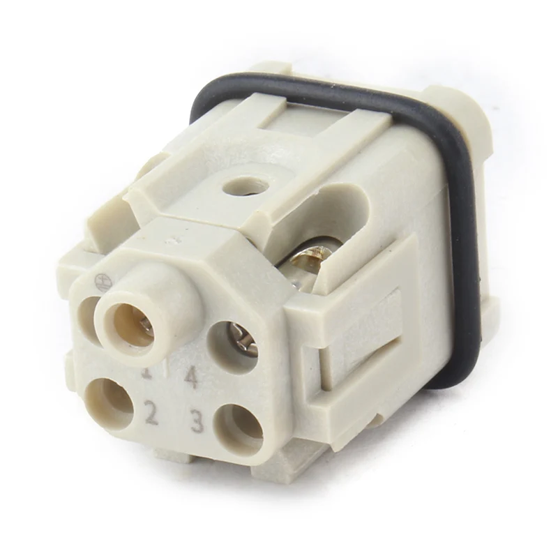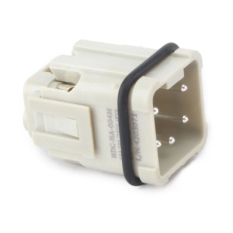 It is worked with 10A H3A-MTG Housing heavy duty connector. M HA 4 Pin Insert Heavy Duty Connector is made of strength PC material and brass silver-plated .Our pins are plated with silver, very good quality and much better electrical conductivity. It is assembled with seal rubber to make it better waterproof situation.