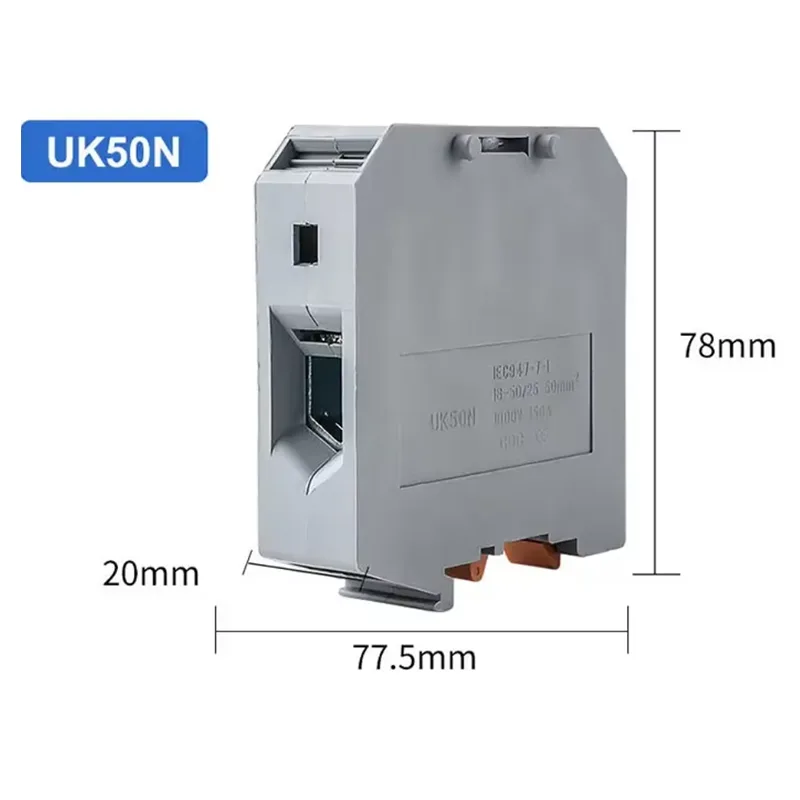 This CHTAR UK 50N 50MM2 Din Rail Terminal Block is connecting with 50mm2 wires and screw type. The insulated housing prevents accidental contact with live parts,reducing shork and short-circuit risks. Secure clamping are made of screw-clamp mechanisms ensure a vibration-resistant connection that minimizes loose wires and overheating.
